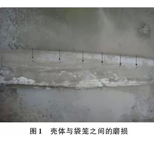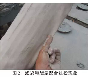 2) 濾袋與殼體之間的磨損。由于設計或安裝的原因,濾袋在安裝后出現和殼體(或內部管撐)干涉,或濾袋距離殼體過近導致濾袋在噴吹時晃動與殼體進行摩擦,使用一段時間后,濾袋在和殼體接觸的部位出現孔洞,造成濾袋的破損。目前,在除塵器殼體設計中,一般考慮濾袋距殼體的距離至少保持75mm以上。由于花板的平整度、水平度、袋籠的垂直度等均有偏差,安裝調整后的濾袋和殼體之間的距離要保持在60mm。 3) 濾袋和袋籠的配合過松(如圖2),在使用中致使濾袋與袋籠之間的破損。在水泥生產線窯尾普遍選用玻纖濾袋,其基布采用的玻璃纖維,最大的缺陷是不能抗折,若在使用中不能固定在袋籠上,袋籠失去了支撐的意義,在工作和清灰兩種狀態下,濾袋的纖維很容易疲勞斷裂,造成濾袋的破損。這就要求,在濾袋和袋籠批量生產的前期進行配合試驗,以確定袋籠和濾袋的最佳尺寸。以玻纖覆膜濾袋為例,名義直徑Ф160 mm,袋籠采用 24 根縱筋,直徑Ф156mm,理論周長490mm,而濾袋半周長(外徑)為250mm,考慮濾袋的厚度,這樣配合的濾袋和袋籠,用手指輕壓濾袋而不會有太大的變形,能緊緊固定在袋籠上。 |