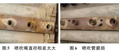 2) 灰斗進風除塵器的袋底磨損。采用灰斗進風方式的除塵器,在使用中濾袋底部由于受氣流的沖刷,呈現一面磨損的情況,這主要和進風方式有直接的關系,若灰斗內部導流板及阻流板加設合理也可避免這種情況的發生。采用側向進氣方式的除塵器則可有效預防袋底的磨損。 3) 噴吹管問題引起的袋口磨損。噴吹管噴吹口的直徑大小相差太大造成噴吹氣流不均、噴吹管制作質量差造成磨損、噴吹管安裝問題引起的噴吹管孔和濾袋不同心等等情況,都會造成濾袋口部的破損(如圖5和圖6)。 |