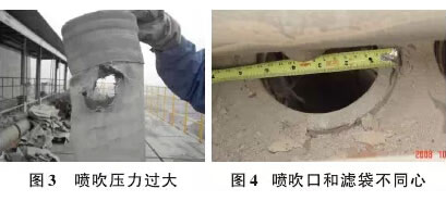 2.2 氣流磨損 1) 脈沖閥工作壓力過大以及噴吹管和濾袋不同心導致的濾袋上口部破損(如圖3和圖4)。玻纖覆膜濾袋適合的清灰壓力為0.2~0.35MPa,一般新投入運行的袋除塵器清灰壓力調整到0.25MPa即可。為達到這個壓力,在壓縮空氣進入脈沖閥之前設置了過濾器和減壓閥。若壓縮空氣的壓力高出0.35MPa,需及時調整,否則造成濾袋和袋籠的磨損,加劇濾袋的損壞,縮短濾袋使用壽命。其它氈類濾料,如P84、滌綸、Nomex等濾袋的清灰壓力可以達到0.5MPa以上。 |
