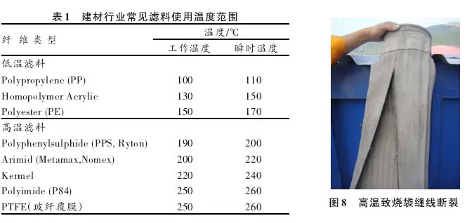 2) 溫度過高造成的濾袋燒毀。任何濾袋都有正常的溫度使用范圍,其用料決定了上限溫度,超出這個溫度,對濾袋造成的損失是不可逆轉的。以玻纖覆膜濾料為例,其正常使用溫度范圍小于260℃,這個溫度值是針對基布、覆膜和縫線而言的,超出這個溫度值,三種材料中的任何一種出現問題必將導致濾袋的失效。在此溫度下,濾料可短時間工作,超出此溫度,易造成濾料不可恢復的永久損傷,濾袋的使用壽命降低甚至損壞。因此,使用中應密切關注除塵器的入口溫度,嚴禁超溫運行。當溫度超過220℃時系統應啟動保護程序,防止燒袋的發生。對有高溫報警的控制系統,上限宜調整到220℃。其它各種濾料都有各自的使用溫度,在實際工作中,應根據不同的濾料設置不同的報警溫度。 建材行業常見濾料使用溫度范圍見表1。如:廣泛用于水泥生產線窯頭的Nomex濾袋,正常使用溫度范圍達200~240 ℃,但由于窯頭溫度變化快,建議報警溫度設置在 200 ℃左右,一旦超溫,系統中的冷風閥開啟或除塵器上的出口閥門關閉等措施保證濾袋不受高溫損壞。圖8為使用溫度超過 280 ℃后玻纖覆膜濾袋縫線斷裂的情況。 |